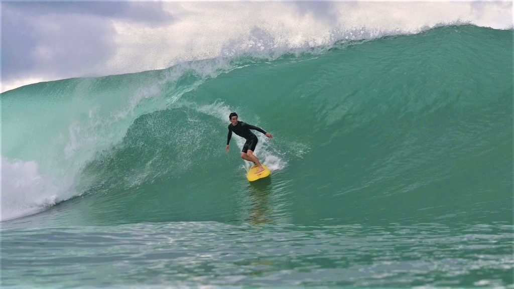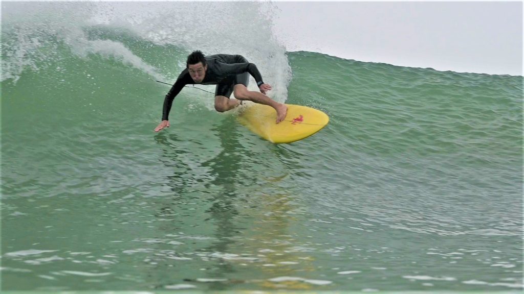木頭杉ストリンガーのサーフボードで波に乗るシェイパーの宗豊.